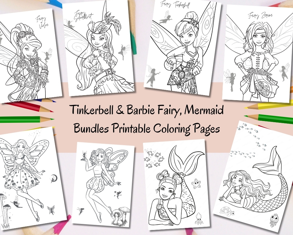 Tinkerbell and Barbie Fairy and Mermaid Printable Coloring pages | Princess Coloring Sheets | Instant Download Kids Activity | Busy Book